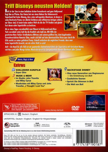 Bolt is the star of the biggest show in Hollywood. The only problem is, he thinks it's real. After he's accidentally shipped to New York City and separated from Penny, his beloved co-star and owner, Bolt must harness all his "super powers" to find a way home.