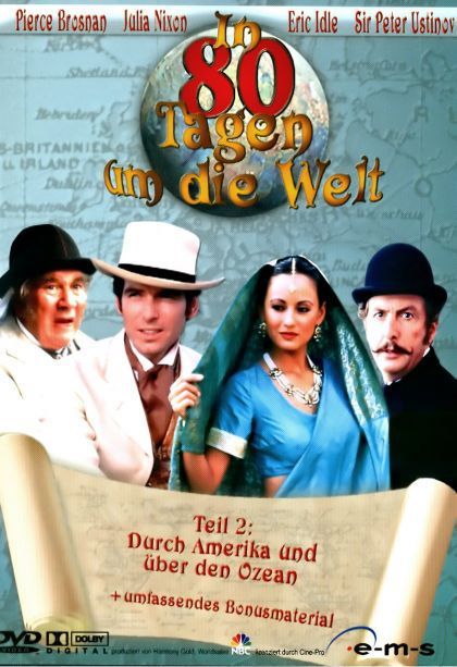 Around the World in 80 Days is a 1989 three-part television Eastmancolor miniseries originally broadcast on NBC. The production garnered three nominations for Emmy awards that year. Starring Pierce Brosnan as Phileas Fogg, Eric Idle as Passepartout, Julia Nickson as Princess Aouda, and Peter Ustinov as Detective Fix, the miniseries featured multiple cameo appearances, including Patrick Macnee, Simon Ward, and Christopher Lee as members of the Reform Club, and Robert Morley, who had a cameo in the 1956 film adaptation, and Roddy McDowall appear as officials of the Bank of England. The heroes travel a slightly different route than in the book, and the script makes several contemporary celebrities part of the story who were not mentioned in the book, such as Sarah Bernhardt, Louis Pasteur, Jesse James, Cornelius Vanderbilt and Queen Victoria.