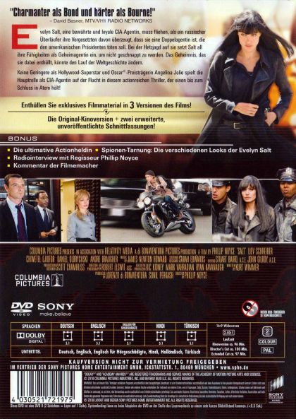 As a CIA officer, Evelyn Salt swore an oath to duty, honor and country. Her loyalty will be tested when a Russian defector accuses her of being a Russian sleeper spy. She goes on the run, using all her skills and years of experience as a covert operative to elude capture, protect her husband, and stay one step ahead of her colleagues at the CIA. Her efforts to prove her innocence only serve to cast doubt on her motives, as the hunt to uncover the truth behind her identity continues and the question remains: "Who is Salt?"