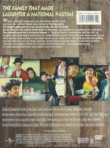 Percy Kilbride and Marjorie Main are the titular Kettles in this collection of four feature films based on the folksy, homespun series that was popular in the late 1940s and early '50s. Follow the humorous adventures (such as finding uranium in the backyard and winning a model home) of this eccentric hillbilly couple living in a rundown shack with 14 of their 15 children. Included is The Egg and I, for which Main received a Best Supporting Actress nod. Cast:Marjorie Main, Percy Kilbride, Richard Long, Meg Randall, Patricia Alphin, Esther Dale, Barry Kelley, Harry Antrim, Isabel O'Madigan, Ida Moore, Emory Parnell, Boyd Davis, O.Z. Whitehead, Ray Bennett, Alvin Hammer, Lester Allen, Chief Yowlachie, Rex Lease, Charles McGraw, Gregg Martell, Jim Backus, Bert Freed, Hal March, Elliott Lewis, Douglas Kennedy, Paul McVey, Ray Collins, Barbara Brown, Claudette Colbert, Fred MacMurray, Louise Allbritton, Billy House, Donald MacBride, Samuel S. Hinds