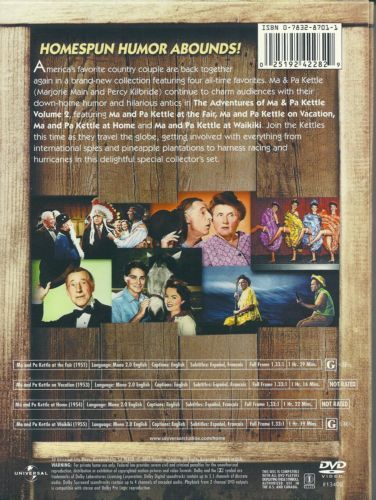 America's favorite country couple are back together again in a brand new collection featuring four of their all-time favorite films. Ma & Pa Kettle (Marjorie Main and Percy Kilbride) continue to charm audiences with their down-home humor and hilarious antics, inspiring in The Adventures of Ma & Pa Kettle: Volume 2, featuring Ma and Pa Kettle at the Fair, Ma and Pa Kettle on Vacation, Ma and Pa Kettle at Home, Ma and Pa Kettle at Waikiki. Join the Kettles this time as they travel the globe, getting involved in everything from international spies and pineapple plantations to harness racing and hurricanes in this delightful special collector's set.