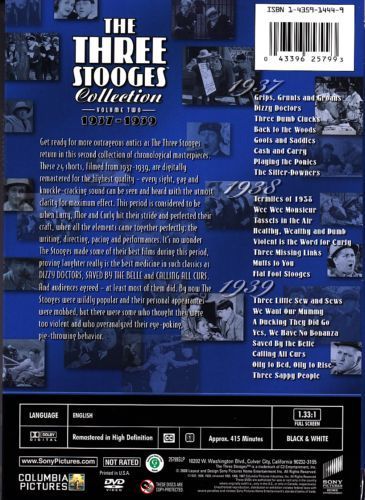 Get ready for more outrageous antics as The Three Stooges return in this second collection of chronological masterpieces. These 24 shorts, filmed from 1937-1939, are digitally remastered for the highest quality - every sight, gag and knuckle-cracking sound can be seen and heard with the utmost clarity for maximum effect. This period is considered to be when Larry, Moe, and Curly hit their stride and perfected their craft, when all the elements came together perfectly: the writing, directing, pacing, and performances. It's no wonder The Stooges made some of their best films during this period, proving laughter really is the best medicine in such classics as Dizzy Doctors, Saved By The Belle, and Calling All Curs. And audiences agreed - at least most of them did. By now The Stooges were wildly popular and their personal appearances were mobbed, but there were some who thought they were too violent and who over analyzed their eye-poking, pie-throwing behavior.
