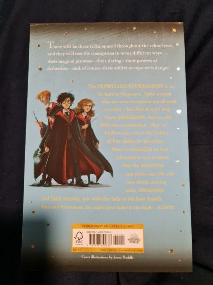 'There will be three tasks, spaced throughout the school year, and they will test the champions in many different ways ... their magical prowess – their daring – their powers of deduction – and, of course, their ability to cope with danger.'The TRIWIZARD TOURNAMENT is to be held at Hogwarts. Only wizards who are over seventeen are allowed to enter – but that doesn't stop Harry DREAMING that he will WIN the competition. Then at Hallowe'en, when the Goblet of Fire makes its selection, Harry is AMAZED to find his name is one of those that the MAGICAL cup picks out. He will face death-defying tasks, DRAGONS and Dark wizards, but with the help of his best friends, Ron and Hermione, he might just make it through – ALIVE!