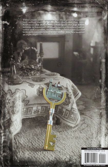 Three years after wrapping up their award-winning, best-selling Locke & Key saga, the team that built Keyhouse returns to Lovecraft, Massachusetts with a new tale of terror and suspense! An impossible birthday gift for two little girls unexpectedly throws open a door to a monster on eight legs! • You never thought it'd happen but... the Eisner-winning series returns to unlock a special tale from Keyhouse's sordid past! • All-new 24-page story by series creators Joe Hill, Gabriel Rodriguez, and Jay Fotos! • Variant cover by "Behind You" creator Brian Coldrick, Mouse Guard's David Petersen, Wraith's Charles Paul Wilson III, and an incentive Small World Key photo cover from Skelton Crew Studios, too.!