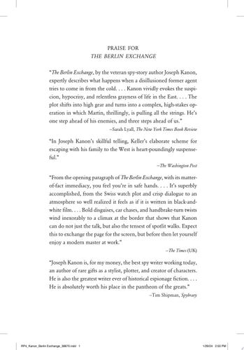 From “the most accomplished spy novelist working today” (The Sunday Times, London), a “heart-poundingly suspenseful” (The Washington Post) espionage thriller set at the height of the Cold War, when a captured American who has spied for the KGB is returned to East Berlin, needing to know who arranged for his release and what they now want from him.Berlin, 1963. An early morning spy swap, not at the familiar setting for such exchanges, nor at Checkpoint Charlie, where international visitors cross into the East, but at a more discreet border crossing, usually reserved for East German VIPs. The Communists are trading two American students caught helping people to escape over the wall and an aging MI6 operative. On the other side of the trade: Martin Keller, a physicist who once made headlines, but who then disappeared into the English prison system. Keller’s most critical possession: his American passport. Keller’s most ardent desire: to see his ex-wife Sabine and their young son. The exchange is made with the formality characteristic of these swaps. But Martin has other questions: Who asked for him? Who negotiated the deal? The KGB? He knows that nothing happens by chance. They want him for something. Not physics—his expertise is out of date. Something else, which he cannot learn until he arrives in East Berlin, when suddenly the game is afoot. Intriguing and atmospheric, with action rising to a dangerous climax, The Berlin Exchange “expertly describes what happens when a disillusioned former agent tries to come in from the cold” (The New York Times Book Review), confirming Kanon as “the greatest writer ever of historical espionage fiction” (Spybrary).