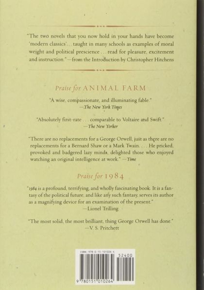 All animals are equals but some animals are more equal than others. George Orwell's classic satire of the Russian Revolution is the account of the bold struggle, initiated by the animals, that transforms Mr. Jones's Manor Farm into Animal Farm, a wholly democratic society built on the credo that all animals are created equal. Out of their cleverness, the pigs Napoleon, Squealer, and Snowball emerge as leaders of the new community in a subtle evolution that proves disastrous. The climax is the brutal betrayal of the faithful horse Boxer, when totalitarian rule is re-established with the bloodstained postscript to the founding slogan: but some animals are more equal than others. War is peace. Freedom is slavery. Ignorance is strength. In 1984, London is a grim city where Big Brother is always watching you and the thought police can practically read your mind. Winston is a man in grave danger for the simple reason that his memory still functions. Drawn into a forbidden love affair, Winston finds the courage to join a secret revolutionary organization called the Brotherhood, dedicated to the destruction of the Party. Together with his beloved Julia, he hazards his life in a deadly match against the powers that be. The two novels that you now hold in your hands have become modern classics, taught in many schools as examples of moral weight and political prescience, read for pleasure, excitement and instruction; a wise, compassionate, and illuminating fable. The New York Times: absolutely first-rate, comparable to Voltaire and Swift. There are no replacements for a George Orwell, just as there are no replacements for a Bernard Shaw or a Mark Twain. He pricked, provoked and badgered lazy minds, delighted those who enjoyed watching an original intelligence at work. Time: 1984 is a profound, terrifying, and wholly fascinating book. It is a fantasy of the political future, and like any such fantasy, serves its author as a magnifying device for an examination of the present. Lionel Trilling: the most solid, the most brilliant, thing George Orwell has done.