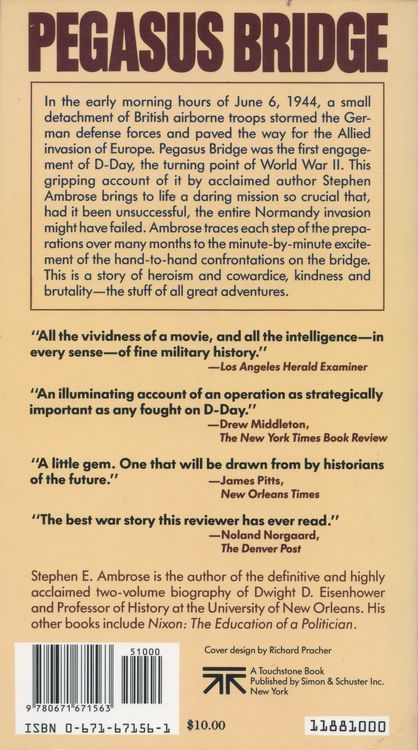 In the early morning hours of June 6, 1944, a small detachment of British airborne troops stormed the German defense forces and paved the way for the Allied invasion of Europe. Pegasus Bridge was the first engagement of D-Day, the turning point of World War II.This gripping account of it by acclaimed author Stephen Ambrose brings to life a daring mission so crucial that, had it been unsuccessful, the entire Normandy invasion might have failed. Ambrose traces each step of the preparations over many months to the minute-by-minute excitement of the hand-to-hand confrontations on the bridge. This is a story of heroism and cowardice, kindness and brutality—the stuff of all great adventures.