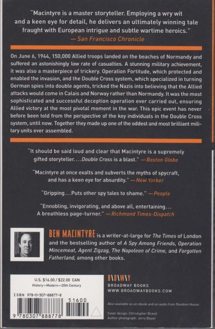In his celebrated bestsellers Agent Zigzag and Operation Mincemeat, Ben Macintyre told the dazzling true stories of a remarkable WWII double agent and of how the Allies employed a corpse to fool the Nazis and assure a decisive victory. In Double Cross, Macintyre returns with the untold story of the grand final deception of the war and of the extraordinary spies who achieved it. On June 6, 1944, 150,000 Allied troops landed on the beaches of Normandy and suffered an astonishingly low rate of casualties. D-Day was a stunning military accomplishment, but it was also a masterpiece of trickery. Operation Fortitude, which protected and enabled the invasion, and the Double Cross system, which specialized in turning German spies into double agents, deceived the Nazis into believing that the Allies would attack at Calais and Norway rather than Normandy. It was the most sophisticated and successful deception operation ever carried out, ensuring that Hitler kept an entire army awaiting a fake invasion, saving thousands of lives, and securing an Allied victory at the most critical juncture in the war. The story of D-Day has been told from the point of view of the soldiers who fought in it, the tacticians who planned it, and the generals who led it. But this epic event in world history has never before been told from the perspectives of the key individuals in the Double Cross System. These include its director (a brilliant, urbane intelligence officer), a colorful assortment of MI5 handlers (as well as their counterparts in Nazi intelligence), and the five spies who formed Double Cross’s nucleus: a dashing Serbian playboy, a Polish fighter-pilot, a bisexual Peruvian party girl, a deeply eccentric Spaniard with a diploma in chicken farming and a volatile Frenchwoman, whose obsessive love for her pet dog very nearly wrecked the entire plan. The D-Day spies were, without question, one of the oddest military units ever assembled, and their success depended on the delicate, dubious relationship between spy and spymaster, both German and British. Their enterprise was saved from catastrophe by a shadowy sixth spy whose heroic sacrifice is revealed here for the first time. With the same depth of research, eye for the absurd and masterful storytelling that have made Ben Macintyre an international bestseller, Double Cross is a captivating narrative of the spies who wove a web so intricate it ensnared Hitler’s army and carried thousands of D-Day troops across the Channel in safety.