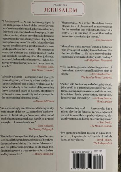 Jerusalem is the universal city, the capital of two peoples, the shrine of three faiths; it is the prize of empires, the site of Judgement Day and the battlefield of today's clash of civilizations. From King David to Barack Obama, from the birth of Judaism, Christianity and Islam to the Israel-Palestine conflict, this is the epic history of three thousand years of faith, slaughter, fanaticism and coexistence. How did this small, remote town become the Holy City, the "center of the world" and now the key to peace in the Middle East? In a gripping narrative, Simon Sebag Montefiore reveals this ever-changing city in its many incarnations, bringing every epoch and character blazingly to life. Jerusalem's biography is told through the wars, love affairs and revelations of the men and women--kings, empresses, prophets, poets, saints, conquerors and whores--who created, destroyed, chronicled and believed in Jerusalem. As well as the many ordinary Jerusalemites who have left their mark on the city, its cast varies from Solomon, Saladin and Suleiman the Magnificent to Cleopatra, Caligula and Churchill; from Abraham to Jesus and Muhammad; from the ancient world of Jezebel, Nebuchadnezzar, Herod and Nero to the modern times of the Kaiser, Disraeli, Mark Twain, Lincoln, Rasputin, Lawrence of Arabia and Moshe Dayan. Drawing on new archives, current scholarship, his own family papers and a lifetime's study, Montefiore illuminates the essence of sanctity and mysticism, identity and empire in a unique chronicle of the city that many believe will be the setting for the Apocalypse. This is how Jerusalem became Jerusalem, and the only city that exists twice--in heaven and on earth.