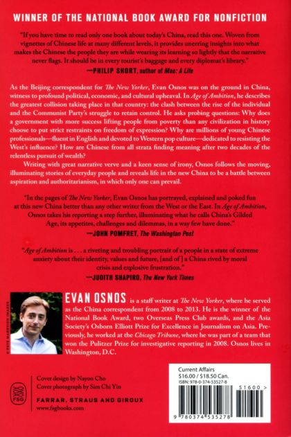 Writing with great narrative verve and a keen sense of irony, Osnos follows the moving stories of everyday people and reveals life in the new China to be a battleground between aspiration and authoritarianism, in which only one can prevail.