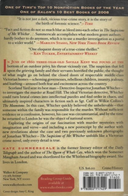 In June of 1860 three-year-old Saville Kent was found at the bottom of an outdoor privy, his throat viciously cut. The suspicion that fell upon the grieving family and their servants horrified the public; the thought of what might go on behind the closed doors of respectable middle-class Victorian homes -- scheming governesses, rebellious children, insanity, jealousy, and loathing -- aroused both fear and excitement across the country. Scotland Yard sent its best man -- Detective-Inspector Jonathan Whicher -- to investigate the murder at Road Hill. The ideal Victorian detective, Whicher could turn brutal crimes into intellectual puzzles and find order in chaos, and ultimately inspired characters in fiction such as Sgt. Cuff in Wilkie Collins' "The Moonshine". In this case, Whicher quickly believed the unbelievable -- that someone within the family was responsible for the murder. Without sufficient evidence or a confession, however, his case was circumstantial, and by the time he returned to London he was the object of national scorn. Exploring the origins of our fascination with murder mysteries with imagination and verve -- and including a new postscript by the author with new revelations about the case and two previously unknown photographs of Jonathan Whicher -- "The Suspicions of Mr. Whicher" unfolds like a Victorian crime novel, only every detail is true. About the Author____________________ Kate Summerscale is the former literary editor of the Daily Telegraph and the author of "The Queen of Whale Cay", which won the Somerset Maugham Award and was shortlisted for the Whitbread biography award. She lives in London.