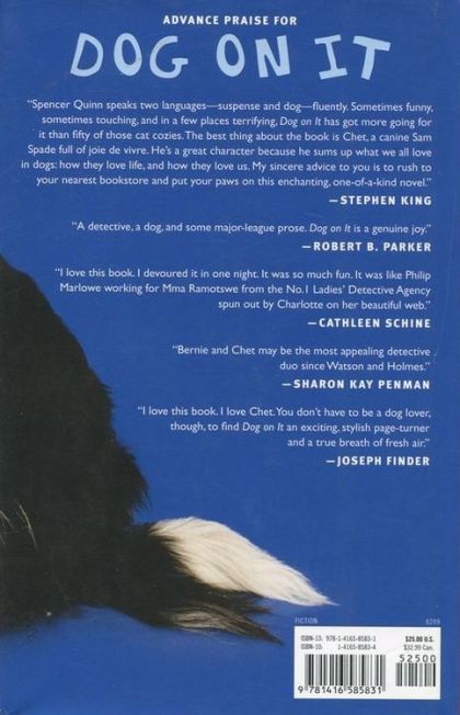 Meet Chet, the wise and lovable canine narrator of Dog on It, who works alongside Bernie, a down-on-his-luck private investigator. Chet might have flunked out of police school ("I'd been the best leaper in K-9 class, which had led to all the trouble in a way I couldn't remember exactly, although blood was involved"), but he's a detective through and through. In this, their first adventure, Chet and Bernie investigate the disappearance of Madison, a teenage girl who may or may not have been kidnapped, but who has definitely gotten mixed up with some very unsavory characters. A well-behaved, gifted student, she didn't arrive home after school and her divorced mother is frantic. Bernie is quick to take the case -- something about a cash flow problem that Chet's not all that clear about -- and he's relieved, if vaguely suspicious, when Madison turns up unharmed with a story that doesn't add up. But when she disappears for a second time in a week, Bernie and Chet aren't taking any chances; they launch a full-blown investigation. Without a ransom demand, they're not convinced it's a kidnapping, but they are sure of one thing: something smells funny. Their search for clues takes them into the desert to biker bars and other exotic locals, with Chet's highly trained nose leading the way. Both Chet and Bernie bring their own special skills to the hunt, one that puts each of them in peril. But even as the bad guys try to turn the tables, this duo is nothing if not resourceful, and the result is an uncommonly satisfying adventure. With his doggy ways and his endearingly hardboiled voice, Chet is full of heart and occasionally prone to mischief. He is intensely loyal to Bernie, who, though distracted by issues that Chet has difficulty understanding -- like divorce, child custody, and other peculiar human concerns -- is enormously likable himself, in his flawed, all-too-human way. (-book jacket)