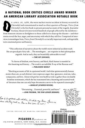 On April 25, 1986, the worst nuclear reactor accident in history occurred in Chernobyl. Until now, all of the books published in English focused on the facts, names, and data. Voices from Chernobyl presents first-hand accounts of what happened to the people of Belarus and the fear, anger, and uncertainty that they lived through. In order to give a voice to their experiences, Svetlana Alexievich--a journalist by trade--interviewed hundreds of people who had been affected by the meltdown. From innocent citizens to firefighters to those called in to clean up the disaster, Voices from Chernobyl is a crucial document of what happened and how people reacted to it. Alexievich presents these interviews in monologue form, giving readers a harrowing inside view into the minds of the affected people untempered by government spin, accusations, or judgements, leaving the reader with just the life-shattering pain of living through such an event and its aftermath.