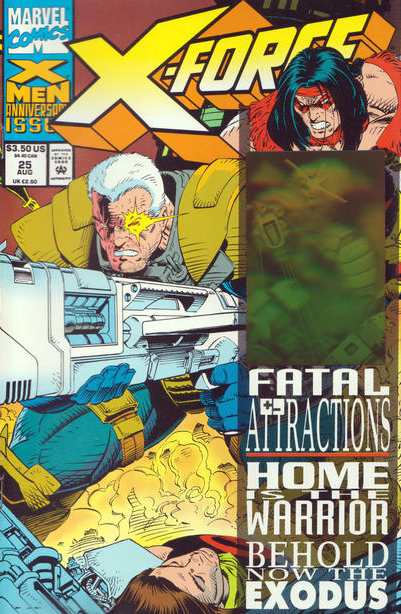 This 48-page book with a wraparound cover and a state-of-the-art hologram is bursting with action! Sam makes a deal for Cable's safe return, choosing between his property and his legacy! Magneto's emissary, Exodus, offers Cannonball and Sunspot a place to stay in Avalon. Imagine Cable's reaction when he discovers his new tenants!