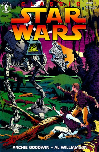The events in Classic Star Wars take place between the first and second Star Wars films, and each issue is jam-packed with action. Our debut issue is no exception: Luke and Leia embark on a scouting mission, are pursued by Imperial troops, and fall into the clutches of a bounty hunter whose real target is Han Solo! Whew! The whole shebang is written by Archie Goodwin, drawn by Al Williamson, and colored by Steve Buccellato, with a new cover by Williamson.