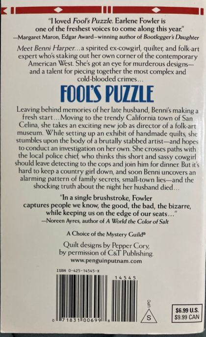 Young, recently widowed Benni Harper, the foolhardy heroine in this predictable debut, leaves her ranch after her husband's accidental death and becomes the curator of the folk-art museum in the coastal California town of San Celina. Benni is frantically trying to assemble a quilt show when she discovers a local potter stabbed to death in the museum studio. Benni's flaky 21-year-old cousin Rita, whom Benni had seen driving away from the museum, disappears and becomes a prime suspect. When Rita calls asking for money, Benni determines not to tell the police, whose new chief, Gabe Ortiz, has warned her not to interfere in the investigation, and decides to clear Rita by finding the real murderer. The day that the quilt show opens, Benni finds a plastic bag filled with money in the attic of the museum but waits to tell Ortiz until after the opening party. When he goes to the attic to investigate, he finds, instead, the body of the museum handyman. Fowler connects all the deaths in her plot, leaving no threads hanging, but Benni's reckless actions and her love-hate relationship with the enigmatic Ortiz yield an unconvincing narrative.