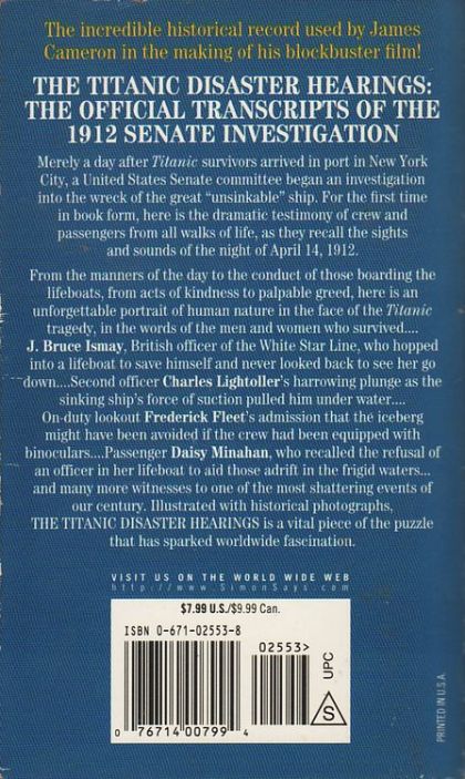 Merely a day afterTitanicsurvivors arrived in port in New York City, a United States Senate committee began an investigation into the wreck of the great "unsinkable" ship. For the first time in book form, here is the dramatic testimony of crew and passengers from all walks of life, as they recall the sights and sounds of the night of April 14, 1912.From the manners of the day to the conduct fo those boarding the lifeboats, from acts of kindness to palpable greed, here is an unforgettable portrait of human nature in the face of theTitanictragedy, in the words of the men and women who survived....J. Bruce Ismay,British officer of the White Star Line, who hopped into a lifeboat to save himself and never looked back to see her go down....Second officerCharles Lightoller'sharrowing plunge as the sinking ship's force of suction pulled him under water....On-duty lookoutFrederick Fleet'sadmission that the iceberg might have been avoided if the crew had been equipped with binoculars....PassengerDaisy Minahan,who recalled the refusal of an officer in her lifeboat to aid those adrift in the frigid waters...and many more witnesses to one of the most shattering events of our century. Illustrated with historical photographs, TheTitanic Disaster Hearingsis a vital piece of the puzzle that has sparked worldwide fascination.