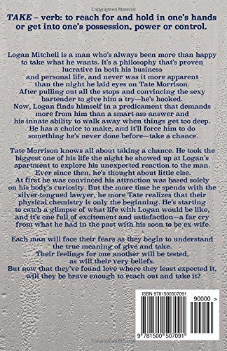 TAKE - verb: to reach for and hold in one's hands or get into one's possession, power or control. Logan Mitchell is a man who's always been more than happy to take what he wants. It's a philosophy that's proven lucrative in both his business and personal life, and never was it more apparent than the night he laid eyes on Tate Morrison. After pulling out all the stops and convincing the sexy bartender to give him a try-he's hooked.Now, Logan finds himself in a predicament that demands more from him than a smart-ass answer and his innate ability to walk away when things get too deep.He has a choice to make, and it'll force him to do something he's never done before-take a chance. Tate Morrison knows all about taking a chance. He took the biggest one of his life the night he showed up at Logan's apartment to explore his unexpected reaction to the man.Ever since then, he's thought about little else.At first he was convinced his attraction was based solely on his body's curiosity. But the more time he spends with the silver-tongued lawyer, the more Tate realizes that their physical chemistry is only the beginning.He's starting to catch a glimpse of what life with Logan would be like, and it's one full of excitement and satisfaction-a far cry from what he had in the past with his soon to be ex-wife. Each man will face their fears as they begin to understand the true meaning of give and take. Their feelings for one another will be tested, as will their very beliefs. But now that they've found love where they least expected it, will they be brave enough to reach out and take it?