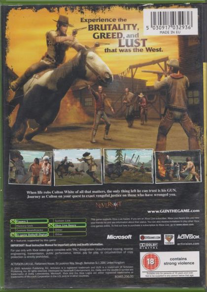 Set in the untamed West of the late-1800s, GUN is a free-roaming action-adventure game that takes players to a world without laws where greed, lust and murder are rampant. As Colton White, a vengeful gunslinger, players must straddle the line between good and evil as they showdown against corrupt lawmen, a murderous preacher, renegade army psychopaths, merciless outlaws and unforgiving Native Americans, while waging war on horseback, collecting bounties, and commandeering trains. Players travel through an action-packed landscape of high mountain wilderness, deserts and bustling territorial towns in an epic story of betrayal, greed, and revenge.