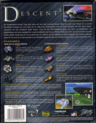 The vertigo continues as the highly anticipated sequel to Descent I and II takes the mind-bending, pulse-pounding experience to another level! This time around, you will experience not only the same frenzied, subterranean shooting action, but also the thrill of flying out of the mines into the planetary atmosphere; where you can soar above the surface of the planet, engage in combat with enemy air and ground forces and use 10 new, lethal weapons to obliterate the most sophisticated robots to date