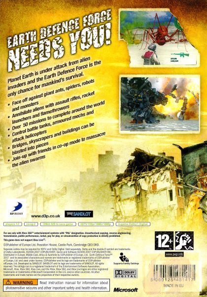 The arcade-style third-person shooter equips players with an arsenal of weapons, vehicles and loyal team mates in order to defeat a wide variety of attackers ranging from giant ants and spiders to robots and monsters standing more than 20 stories tall. Players have more than 150 weapon variations to choose from including assault rifles, rocket launches and flamethrowers and the support of AI-controlled Earth Defence Force team mates who will battle beside them throughout the game—players can also join forces in co-op mode and battle together.