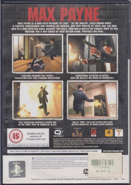 Max Payne is a stylish, urban, revenge driven action game based in New York Citys grimy underground. A groundbreaking rendering engine allows for heart-stopping, photo-realistic visuals and breath taking movie quality effects as Max Payne fights his way to uncover the truth. Max Payne is a dark, searing tale of corruption and murder which combines the most popular elements from todays biggest box office action thrillers with the latest in videogame technology to deliver what promises to be one of the most original gameplay experiences this year.