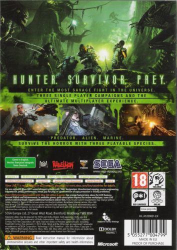 In the all-new Aliens vs. Predator players will have the chance to take the role of the three infamous species; the Colonial Marine, the Predator and the Alien. Each of the three species has its very own distinct story-driven single-player campaign mode that interweaves with the campaigns of the other two species. Aliens vs. Predator will also feature unique 3-way online multiplayer, allowing gamers to pit the three species against each other in the ultimate battle for survival and for the right to be crowned the deadliest species.