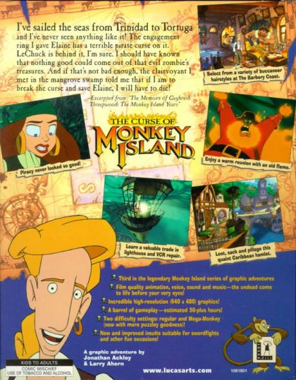 Quick - what has dozens of monkeys, ghost pirates galore and more insults than a cranky parrot? Why, The Curse of Monkey Island, of course! In this highly anticipated third installment to LucasArts' popular Monkey Island series of graphic adventures, Guybrush Threepwood once again takes up dull blade and rapier wit against the nefarious demon-pirate LeChuck. In Curse, Guybrush must save his one true love, Elaine Marley, from being turned into the evil pirate's zombie bride. But, hoping to marry Elaine himself, Guybrush unknowingly slips a cursed ring onto her finger that transforms her into a gold statue. He must then find a way to change Elaine back to her beautiful self and stop LeChuck from carrying out his sinister plans. Aye, 'tis a rollicking piratey adventure that's sure to challenge the mind and shiver a few timbers!