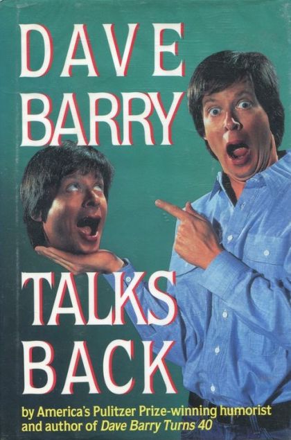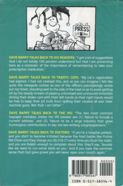 When Dave Barry writes funny, you write back. And when you write funny, Dave Barry talks back! Besides being a best-selling author and Pulitzer Prize-winning writer, Dave Barry wins another informal sweepstakes: He gets more reaction from readers like you than any other columnist in the United States. Whether he’s soliciting your suggestions for cutting the federal deficit (“rent the Stealth bomber out for proms”), heading up the reader-inspired Exploding Animal Institute, or conducting the Official National Insect Bug-off, Dave Barry talks back! And now the absolute best of Dave Barry is available in book form, complete with those items sent in by people like you – Dave’s legion of Alert Readers all across the country who have escaped their ward attendants long enough to warn Dave of the dangers of exploding cows, toilets, snails, whales, human stomachs, and politicians. But you’ll see that Dave Barry doesn’t’ just talk back to his readers. Dave Barry talks back to traffic cops, the IRS, doctors, Congress, the Cable Company collection agency, and his very dumb dugs. He goes to Walt “You will have fun!”Disney World; he escapes vacationing dentists in Hawaii only to run into Imelda Marcos; he tries to figure out why the British talk that way. He even duels with a spider named Bernice. Dave Barry is not just the funniest writer in America, he’s the most interactive. Complete with a new introduction, notes on the columns that his readers have liked best, and illustrated by famed cartoonist Jeff MacNelly of “Shoe” fame, DAVE BARRY TALKS BACK is a very funny, quintessentially Barry book that talks back to everybody, including you mom. (-book jacket)
