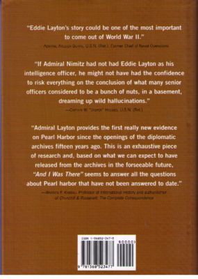 Why did the Japanese attack Pearl Harbor? How did they inflict the greatest military defeat in American history? What went wrong? "And I Was There" is the first book by a top-ranking American navy officer to answer these questions. Admiral Layton scrupulously kept these secrets to himself until the recent declassification of a half million documents from U.S. military archives. Only then did Layton believe he was free to tell his story. He names those who knew about Japanese intentions, how they acquired their knowledge and how they misused it. He speaks with unique authority. He was the Pacific Fleet's intelligence officer prior to Pearl Harbor, and he continued to serve in the same capacity for Admiral Nimitz throughout the war. As Layton says: he was there.