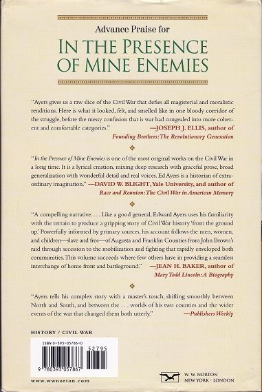 Our standard Civil War histories tell a reassuring story of the triumph, in an inevitable conflict, of the dynamic, free-labor North over the traditional, slave-based South, vindicating the freedom principles built into the nation's foundations. But at the time, on the borderlands of Pennsylvania and Virginia, no one expected war, and no one knew how it would turn out. The one certainty was that any war between the states would be fought in their fields and streets. Edward L. Ayers gives us a different Civil War, built on an intimate scale. He charts the descent into war in the Great Valley spanning Pennsylvania and Virginia. Connected by strong ties of every kind, including the tendrils of slavery, the people of this borderland sought alternatives to secession and war. When none remained, they took up war with startling intensity. As this book relays with a vivid immediacy, it came to their doorsteps in hunger, disease, and measureless death. Ayers's Civil War emerges from the lives of everyday people as well as those who helped shape history—John Brown and Frederick Douglass, Lincoln, Jackson, and Lee. His story ends with the valley ravaged, Lincoln's support fragmenting, and Confederate forces massing for a battle at Gettysburg.