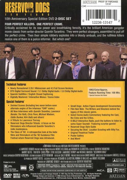 A botched robbery indicates a police informant, and the pressure mounts in the aftermath at a warehouse. Crime begets violence as the survivors -- veteran Mr. White, newcomer Mr. Orange, psychopathic parolee Mr. Blonde, bickering weasel Mr. Pink and Nice Guy Eddie -- unravel.
