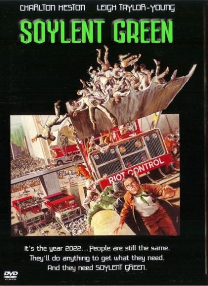 In the year 2022, overcrowding, pollution, and resource depletion have reduced society’s leaders to finding food for the teeming masses. The answer is Soylent Green.