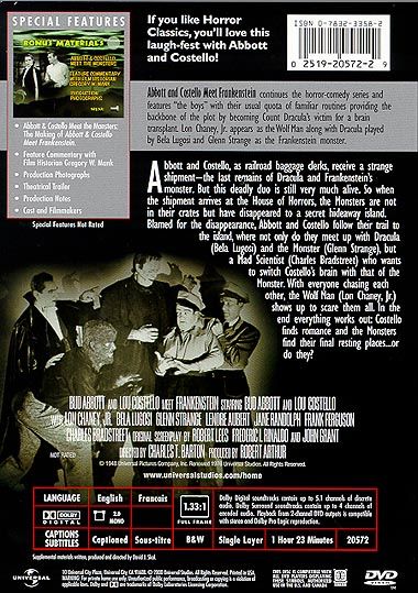 The Wolf Man tries to warn a dimwitted porter that Dracula wants his brain for Frankenstein monster's body.