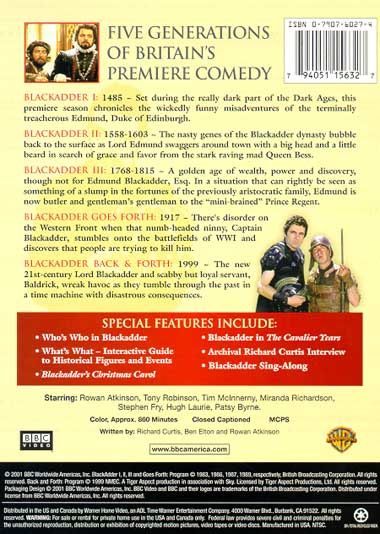 Through four series and a few specials, Edmund Blackadder and his greasy sidekick Baldrick conjure up cunning plans as Edmund tries to take advantage of desperate times. These "situation tragedies" had obvious parallels from the Dark Ages to Elizabethan times, the rule of mad George III, and The Great War. Some character names from the first series are open to debate as they are shown in fancy script on screen, usually against unhelpful backgrounds.