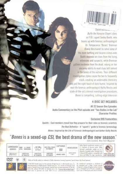 David Boreanaz (Angel, Buffy the Vampire Slayer) stars as F.B.I. Agent Seeley Booth, who teams up with forensic anthropologist Dr. Temperance "Bones" Brennan (Emily Deschanel) to solve some of the most baffling and bizarre crimes ever. Booth depends on clues from the living, witnesses and suspects, while Brennan gathers evidence from the dead, relying on her uncanny ability to read clues left behind in the bones of the victims. Their different investigative styles cause the two to frequently clash, creating an undeniable chemistry and just the right touch of dark humor. Inspired by real-life forensic anthropologist Kathy Reichs and state-of-the-art criminal investigation procedures, Bones is compelling, cutting-edge television.