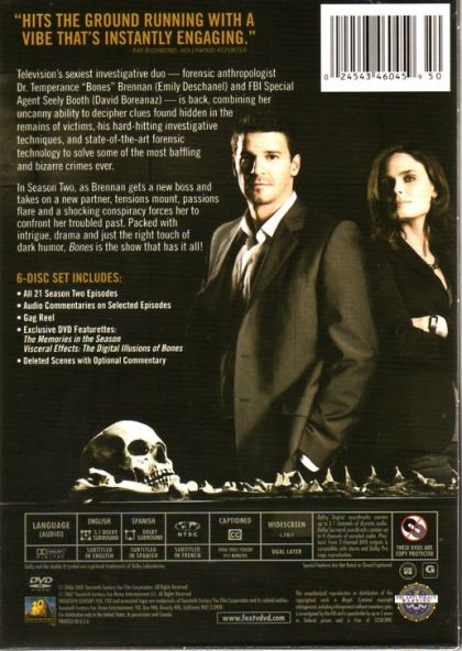David Boreanaz (Angel, Buffy the Vampire Slayer) stars as F.B.I. Agent Seeley Booth, who teams up with forensic anthropologist Dr. Temperance "Bones" Brennan (Emily Deschanel) to solve some of the most baffling and bizarre crimes ever. Booth depends on clues from the living, witnesses and suspects, while Brennan gathers evidence from the dead, relying on her uncanny ability to read clues left behind in the bones of the victims. Their different investigative styles cause the two to frequently clash, creating an undeniable chemistry and just the right touch of dark humor. Inspired by real-life forensic anthropologist Kathy Reichs and state-of-the-art criminal investigation procedures, Bones is compelling, cutting-edge television.