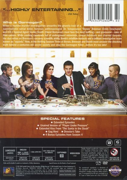 David Boreanaz (Angel, Buffy the Vampire Slayer) stars as F.B.I. Agent Seeley Booth, who teams up with forensic anthropologist Dr. Temperance "Bones" Brennan (Emily Deschanel) to solve some of the most baffling and bizarre crimes ever. Booth depends on clues from the living, witnesses and suspects, while Brennan gathers evidence from the dead, relying on her uncanny ability to read clues left behind in the bones of the victims. Their different investigative styles cause the two to frequently clash, creating an undeniable chemistry and just the right touch of dark humor. Inspired by real-life forensic anthropologist Kathy Reichs and state-of-the-art criminal investigation procedures, Bones is compelling, cutting-edge television.