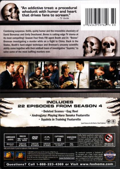 David Boreanaz (Angel, Buffy the Vampire Slayer) stars as F.B.I. Agent Seeley Booth, who teams up with forensic anthropologist Dr. Temperance "Bones" Brennan (Emily Deschanel) to solve some of the most baffling and bizarre crimes ever. Booth depends on clues from the living, witnesses and suspects, while Brennan gathers evidence from the dead, relying on her uncanny ability to read clues left behind in the bones of the victims. Their different investigative styles cause the two to frequently clash, creating an undeniable chemistry and just the right touch of dark humor. Inspired by real-life forensic anthropologist Kathy Reichs and state-of-the-art criminal investigation procedures, Bones is compelling, cutting-edge television.