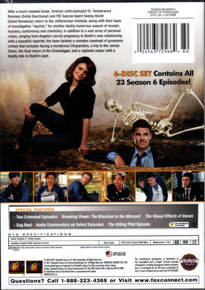 David Boreanaz (Angel, Buffy the Vampire Slayer) stars as F.B.I. Agent Seeley Booth, who teams up with forensic anthropologist Dr. Temperance "Bones" Brennan (Emily Deschanel) to solve some of the most baffling and bizarre crimes ever. Booth depends on clues from the living, witnesses and suspects, while Brennan gathers evidence from the dead, relying on her uncanny ability to read clues left behind in the bones of the victims. Their different investigative styles cause the two to frequently clash, creating an undeniable chemistry and just the right touch of dark humor. Inspired by real-life forensic anthropologist Kathy Reichs and state-of-the-art criminal investigation procedures, Bones is compelling, cutting-edge television.