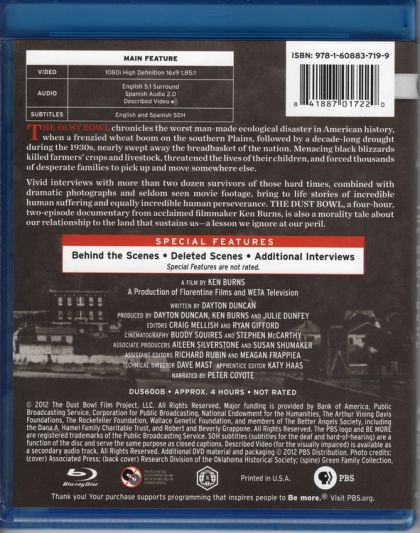 The Dust Bowl chronicles the worst man-made ecological disaster in American history, when a frenzied wheat boom on the southern Plains, followed by a decade-long drought during the 1930s, nearly swept away the breadbasket of the nation. Menacing black blizzards killed farmers’ crops and livestock, threatened the lives of their children, and forced thousands of desperate families to pick up and move somewhere else. Vivid interviews with more than two dozen survivors of those hard times, combined with dramatic photographs and seldom seen movie footage, bring to life stories of incredible human suffering and equally incredible human perseverance. The Dust Bowl, a four-hour, two-episode documentary from acclaimed filmmaker Ken Burns, is also a morality tale about our relationship to the land that sustains us—a lesson we ignore at our peril.