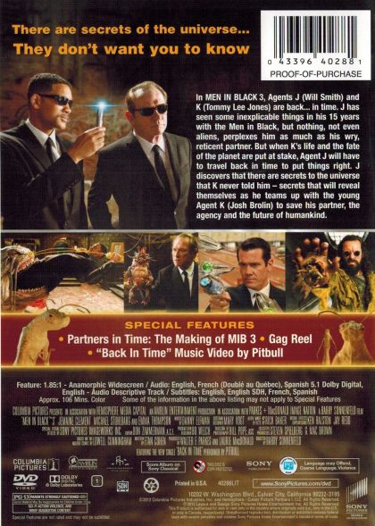 Agents J and K are back...in time. J has seen some inexplicable things in his 15 years with the Men in Black, but nothing, not even aliens, perplexes him as much as his wry, reticent partner. But when K's life and the fate of the planet are put at stake, Agent J will have to travel back in time to put things right. J discovers that there are secrets to the universe that K never told him - secrets that will reveal themselves as he teams up with the young Agent K to save his partner, the agency, and the future of humankind.