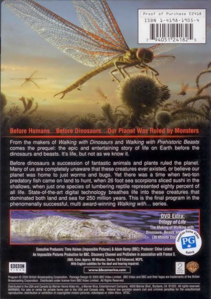 A 90-minute documentary about life before the dinosaurs. Starting from the Cambrian Period (530 MYA) and ending at the Early Triassic Period (248 MYA), Walking With Monsters shows the life and death struggles prehistoric creatures before the dinosaurs went through. It also portrays an accurate picture of our first ancestors.
