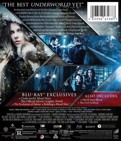 Vampire death dealer Selene fends off brutal attacks from both the Lycan clan and the Vampire faction that betrayed her. With her only allies, David and his father Thomas, she must stop the eternal war between Lycans and Vampires, even if it means she has to make the ultimate sacrifice.