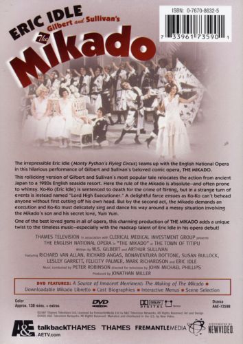 Jonathan Miller set his well-known production of The Mikado, staged for the English National Opera, in a British seaside resort of the 1920s. The result, complete with a chorus of gentlemen of Japan as cartoon-like British peers, emphatically underscores the Englishness of the satire. The occasional non sequiturs, like a bunch of gentry dressed for Ascot and singing in Japanese, are loonily fun, and no more absurd than the fantasyland Japan that Gilbert and Sullivan invented. The time frame, though, seems little more than an excuse for a smart black-and-white production design.