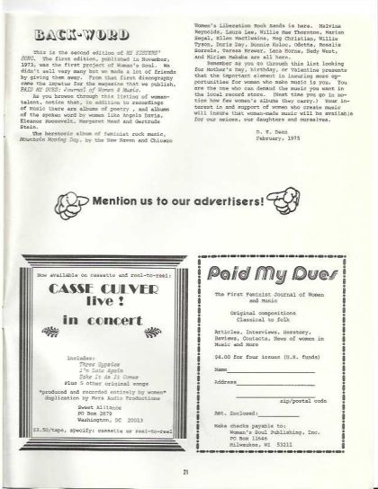 Early record of Lesbian and Women's/Feminist Music - developed by editors of Paid My Dues