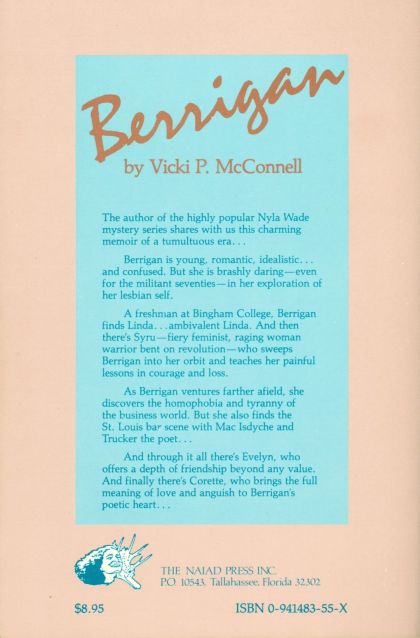Berrigan is young, romantic, idealistic… and confused. But she is brashly daring—even for the militant seventies—in her exploration of her lesbian self. A freshman at Bingham College, Berrigan finds Linda… ambivalent Linda. And then there’s Syru—fiery feminist, raging woman warrior bent on revolution—who sweeps Berrigan into her orbit and teaches her painful lessons in courage and loss. As Berrigan ventures farther afield, she discovers the homophobia and tyranny of the business world. But she also finds the St. Louis bar scene with Mac Isdyche and Trucker the poet… And through it all there’s Evelyn, who offers a depth of friendship beyond any value. And finally there’s Corette, who brings the full meaning of love and anguish to Berrigan’s poetic heart…