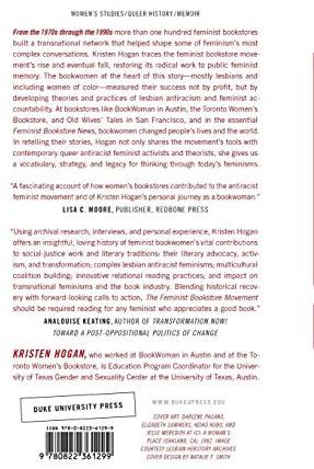 From the 1970s through the 1990s more than one hundred feminist bookstores built a transnational network that helped shape some of feminism's most complex conversations. Kristen Hogan traces the feminist bookstore movement's rise and eventual fall, restoring its radical work to public feminist memory. The bookwomen at the heart of this story—mostly lesbians and including women of color—measured their success not by profit, but by developing theories and practices of lesbian antiracism and feminist accountability. At bookstores like BookWoman in Austin, the Toronto Women’s Bookstore, and Old Wives’ Tales in San Francisco, and in the essential Feminist Bookstore News, bookwomen changed people’s lives and the world. In retelling their stories, Hogan not only shares the movement's tools with contemporary queer antiracist feminist activists and theorists, she gives us a vocabulary, strategy, and legacy for thinking through today's feminisms.