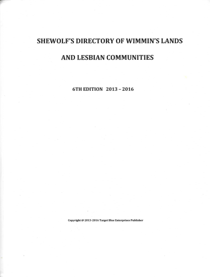 There have been six editions of Shewolf’s Directory of Wimmin’s Lands and Lesbian Communities, from 1994 to 2013, published approximately every three years. Shewolf loved to travel. She made her way from her own land in Louisiana to visit as many lesbian lands as possible. While most of the groups listed are located in the USA, a few are scattered throughout the English-speaking world, and a couple of them are in European countries.
