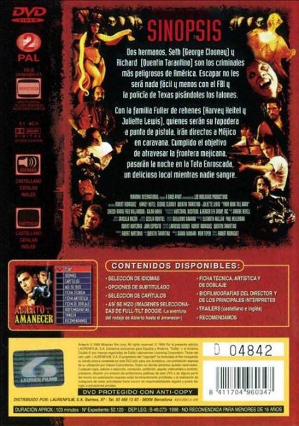 La historia comienza con los hermanos Seth (George Clooney) y Richard Gecko (Quentin Tarantino) que huyen de la justicia tras haber cometido un robo y matado a varios rangers de Texas, policías nacionales y a algunos civiles. Su objetivo es traspasar la frontera y llegar así a México. Para superar los muchos controles policiales de la frontera toman como rehenes a los propietarios de una autocaravana, la familia Fuller, formada por Jacob (Harvey Keitel), un antiguo predicador que perdió la fe tras la muerte de su esposa, y sus dos hijos: Scott (quien tiene apariencia asiática como la de su madre en la fotografía que observa Seth en la billetera de Jakob) y Kate (Juliette Lewis), una adolescente que es la tentación de Richard.